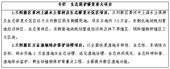 黃河上游生態(tài)保護示范區(qū)。全面落實黃河流域生態(tài)保護和高質(zhì)量發(fā)展戰(zhàn)略,堅持生態(tài)優(yōu)先、綠色發(fā)展,以生態(tài)保護為核心,統(tǒng)籌推進山水林田湖草綜合治理、系統(tǒng)治理、源頭治理,加強生態(tài)修復、水土保持和污染防治,建設(shè)黃河上游未利用土地綜合開發(fā)示范區(qū)和蘭州—新區(qū)—白銀黃河中上游水土保持及生態(tài)修復示范區(qū),為黃河上游地區(qū)生態(tài)保護和綠色發(fā)展崛起打造新區(qū)樣板、作出新區(qū)示范。